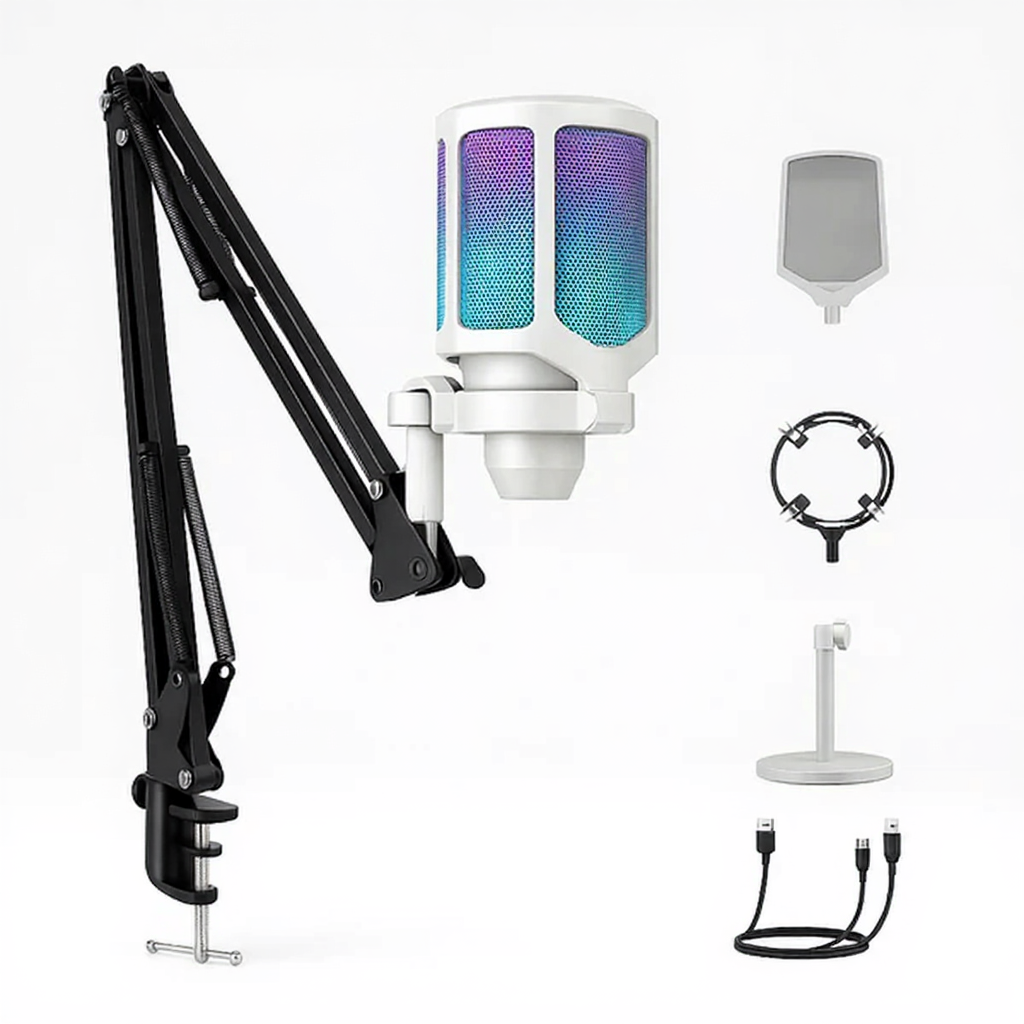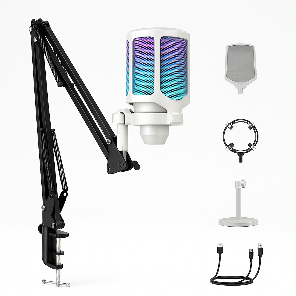 Step up your streaming and gaming setup with the AuraVoice A6 RGB Desktop Microphone – a powerhouse built for creators who demand style, clarity, and performance. Engineered with a cardioid pickup pattern, it captures your voice with stunning precision while filtering out background noise, giving you professional-grade audio whether you’re streaming live, recording content, or coordinating with your team mid-battle.